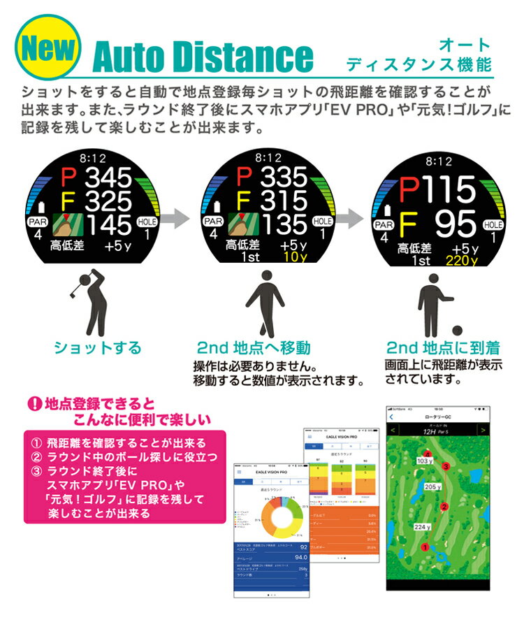 また、ラウンド終了後にスマホアプリ「EV PRO」や「元気!ゴルフ」に記録を残して楽しむことが出来ます。
