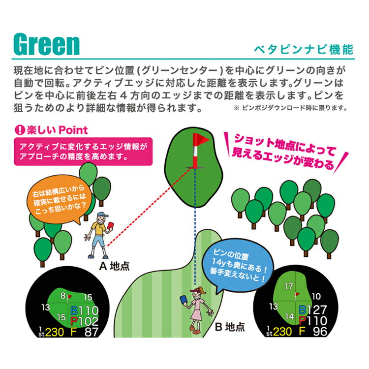 ベタピンナビ機能 現在地に合わせてピン位置(グリーンセンター)を中心にグリーンの向きが自動で回転。