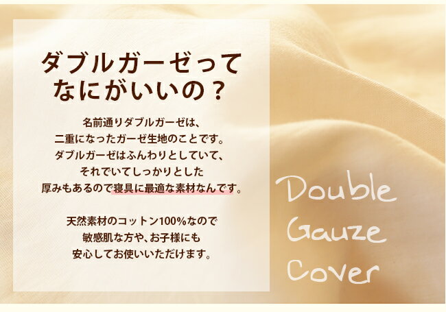 商品詳細 <使えば使うほどに私好みのカバーに育つダブルガーゼ> お洗濯のたびにふんわり お手元に届いたときは少し張りを感じますがお洗濯する度に やわらかさと、ふんわり感が増し肌なじみがどんどんよくなります。