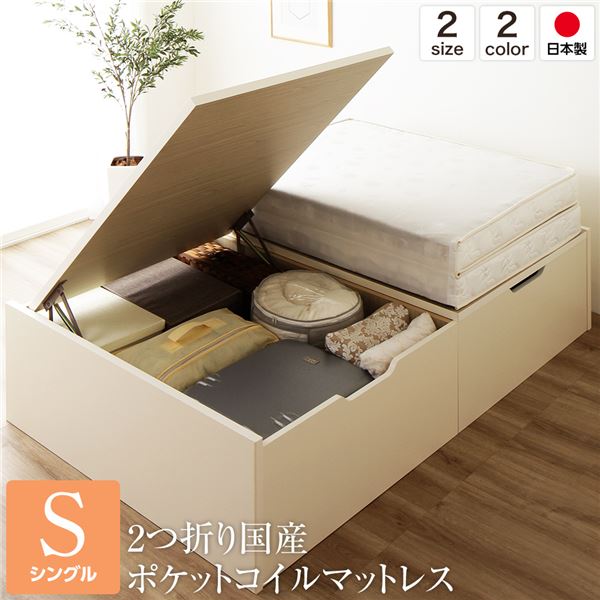 ベッド 国産 木製 収納 跳ね上げ式 横開き 深型 ヘッドレス 大容量 アイボリー シングル ポケットコイルマットレス付き【代引不可】 生活用品・インテリア・雑貨 寝具 ベッド・ソファベッド 収納付きベッド レビュー投稿で次回使える2000円クーポン全員にプレゼント